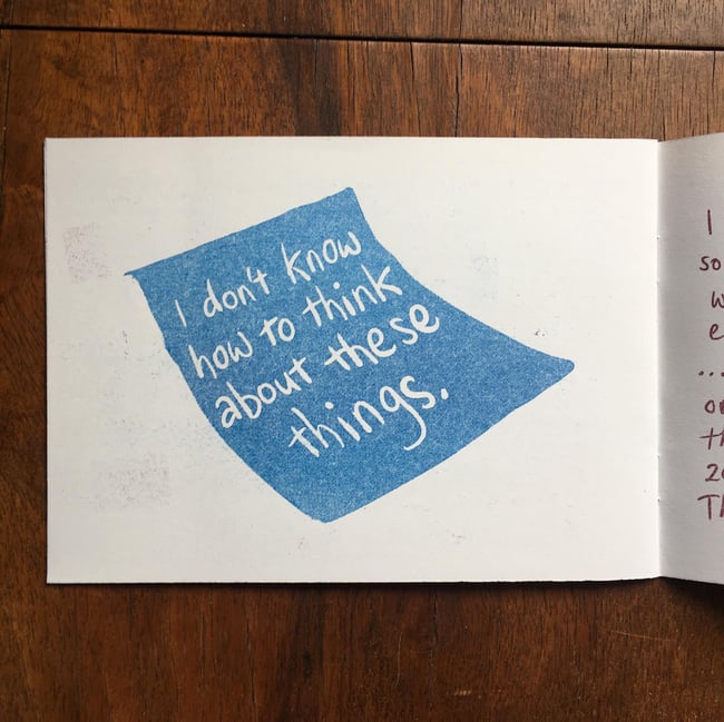 * Two colour risograph (blue/maroon), 16 page booklet, horizontal, saddle stitched, slightly larger than A6.